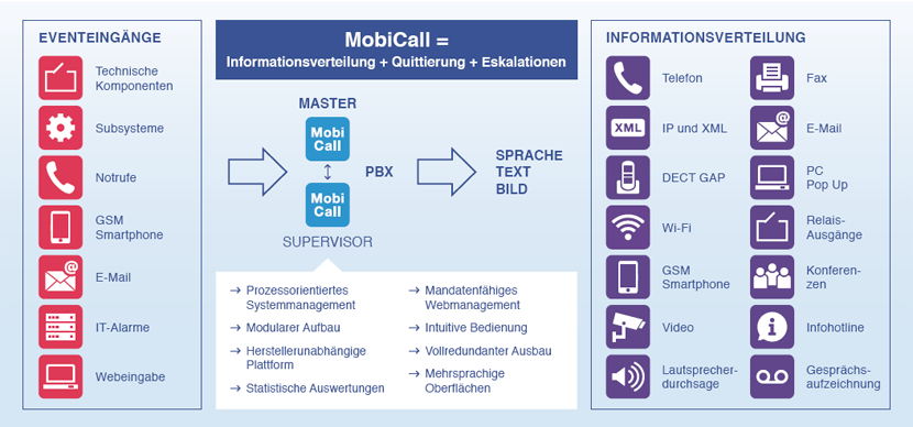 Das einzigartige MobiCall Alarm-, Konferenz- und Informationssystem bietet bereits an der Basis eine sehr breite Palette an Funktionen, die bei anderen Produkten nicht oder nur gegen Aufpreis erhältlich sind. Die MobiCall Applikation kann auch im vernetzten Umfeld mit automatischer Hot-Standby-Umschaltung eingesetzt werden. Dies stellt höchste Anforderungen an die Verfügbarkeit. Das Konzept erlaubt die Konfiguration der Verantwortlichkeit auf jeden einzelnen Alarmeingang – auch über mehrere MobiCall Systeme hinweg. Alle Systeme sind über eine zentralisierte Management-Applikation konfigurierbar. Die Verwaltung und Pflege einer Datenbank pro System wird damit überflüssig.